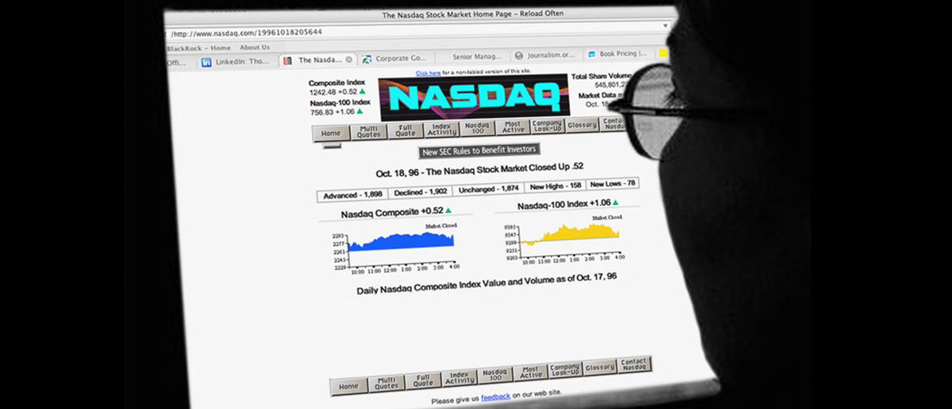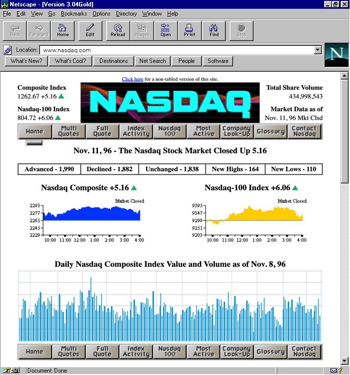 Nasdaq’s first website, nasdaq.com, represented a significant step in the financial world’s adaptation to the digital age. It was the first website to provide real-time stock quotes online (15 minute delayed as required by the SEC at the time) and marked a new chapter in how investors and the public access financial information and services. Not only was financial data now more accessible but also set a new standard for the online availability of such information, democratizing data that was once exclusive to industry professionals.